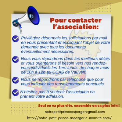 Vous pouvez nous joindre par mail notrepetitprinceasperger@gmail.com ou par téléphone au 06.58.81.63.67